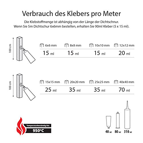 Specificaties: STEIGNER Kachelafdichtingskoord schoorsteenafdichting van keramische vezels, hittebestendig tot 1260 °C, incl. vuurvaste montagelijm, 2,5 m, 10 x 10 mm, SKD01-10
